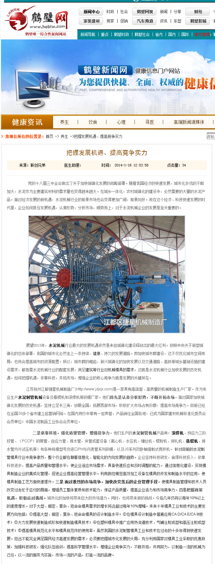 地方政府門(mén)戶網(wǎng)站鶴壁日?qǐng)?bào)社鶴壁新聞網(wǎng)對(duì)懸輥機(jī)、滾焊機(jī)、芯模振動(dòng)模具廠家江都捷星機(jī)械的相關(guān)報(bào)道